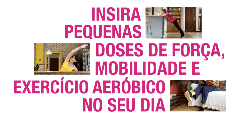 Inclua pequenas doses de atividade física ao longo do seu dia. São pequenos movimentos que trazem grandes benefícios à saúde, como aumento da energia, melhora do humor e fortalecimento muscular.